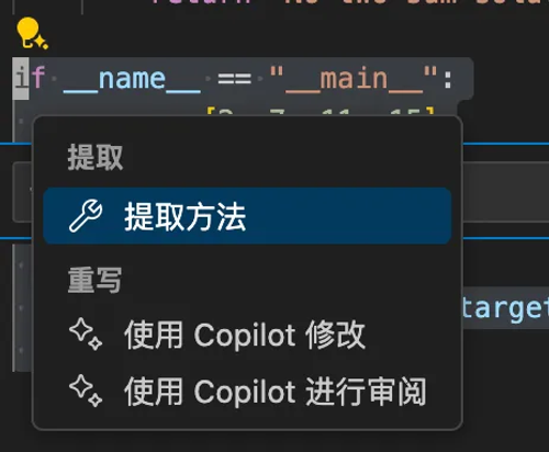 上下文菜单中 Copilot 操作的截图。