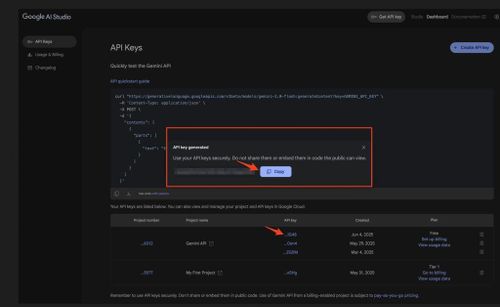 Choose a project, give a name, and create a Gemini API key