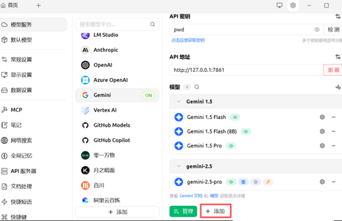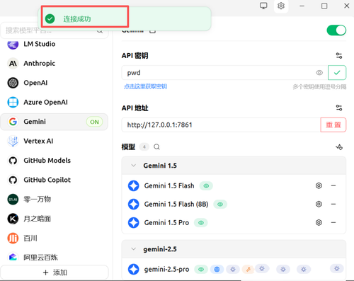 在 Gemini 设置中添加您自己的 API 密钥。