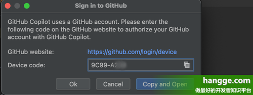 “登录到 GitHub”对话框的屏幕截图。 设备代码显示在标记为“复制并打开”的按钮上方。