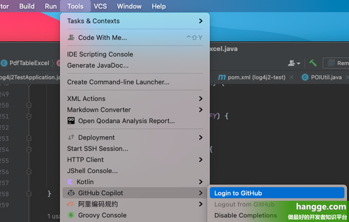 展开的“工具”菜单和“GitHub Copilot”子菜单的屏幕截图。 “登录到 GitHub”选项以蓝色突出显示。