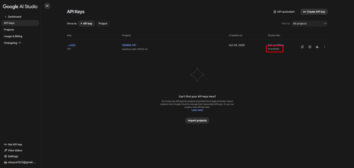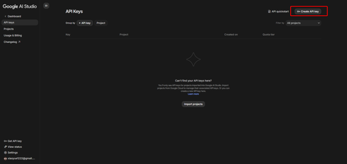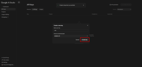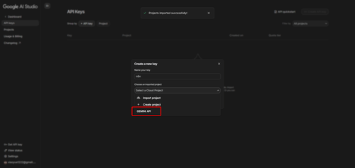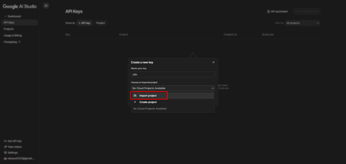 select existing porject or new project gemini api key