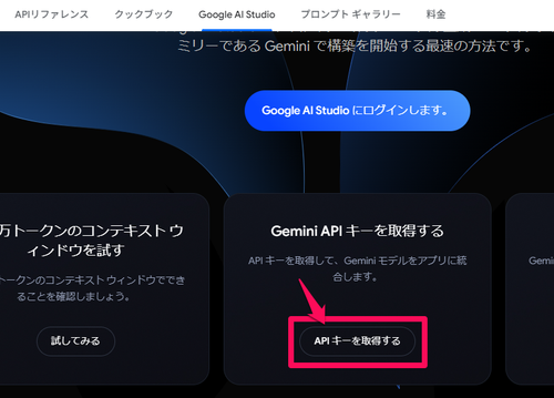 Google AI StudioでAPIキーを取得する操作画面