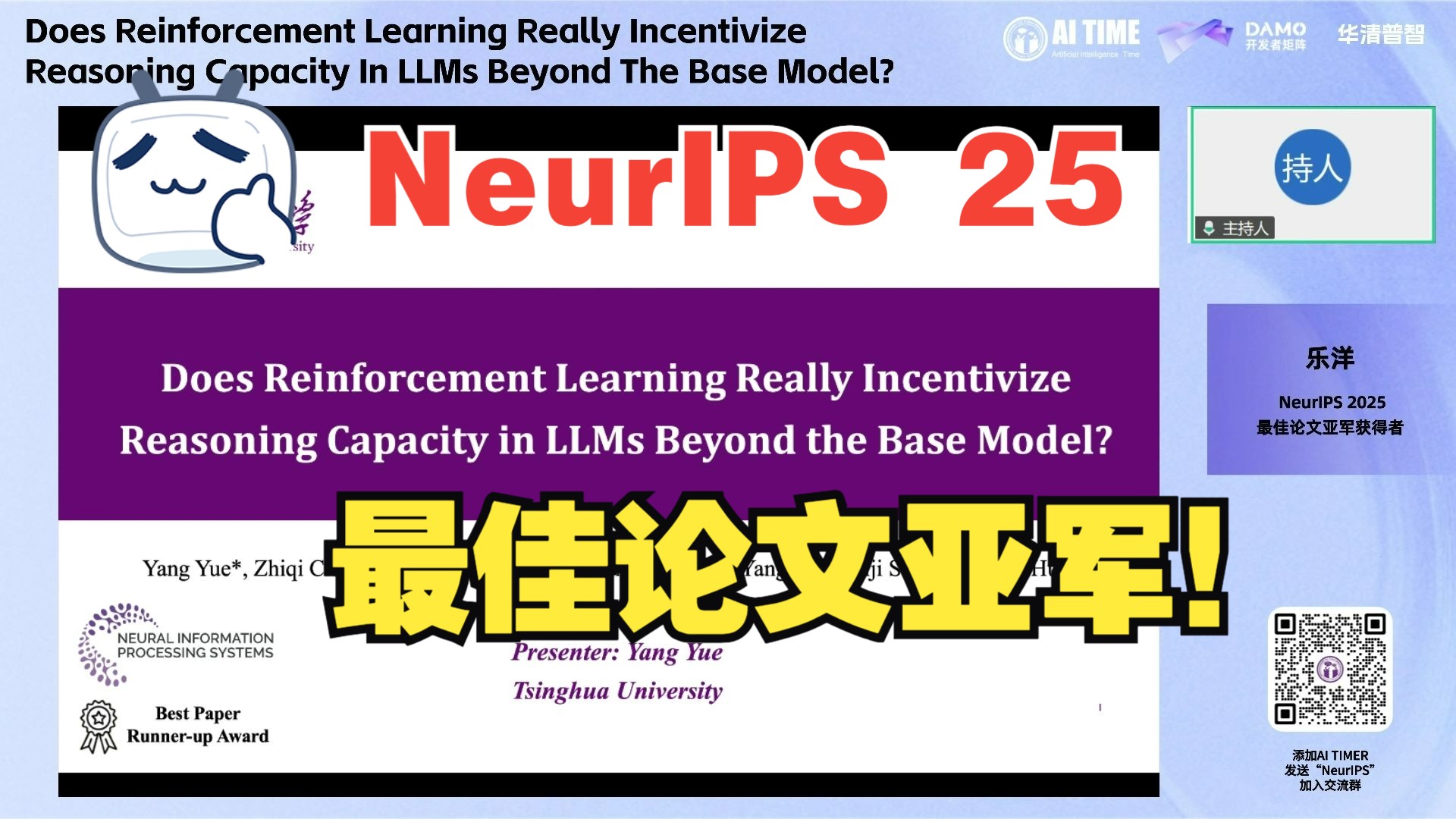 📝 视频简介: 清华大学自动化系宋士吉、黄高老师团队的研究,斩获了AI顶会NeurIPS 2025的最佳论文亚军奖!他们的研究直指当前最火的“深度思考”模型(如