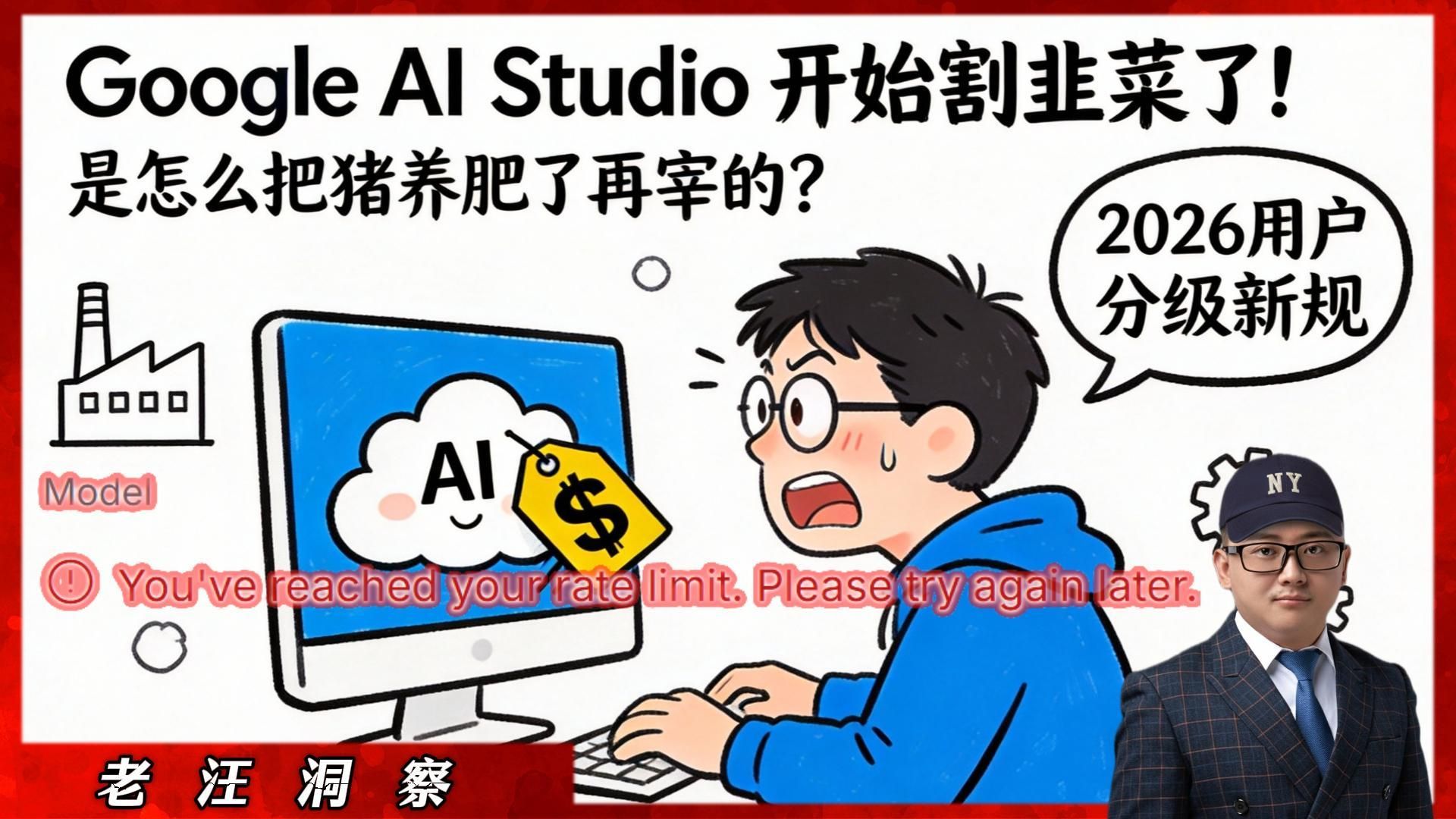 最近很多朋友跑来问我,为什么Google AI Studio总是弹出 You have reached your rate limit 的报错?是不是坏了? 其实,这是Google的一盘大棋——“猪养肥了,该宰了!” 🐷🔪 曾几何时,我们习惯了百万上下文的免费畅享,但从2026年开始,Google彻底撕下了温情脉脉的面纱,将用户冷酷地划分为“免费小白鼠”和“付费VIP”。 本期视频,老汪带你深扒Google AI Studio最新的Tier 1 & Tier 2付费体系,告诉你免费版失去了什么(隐私、速度