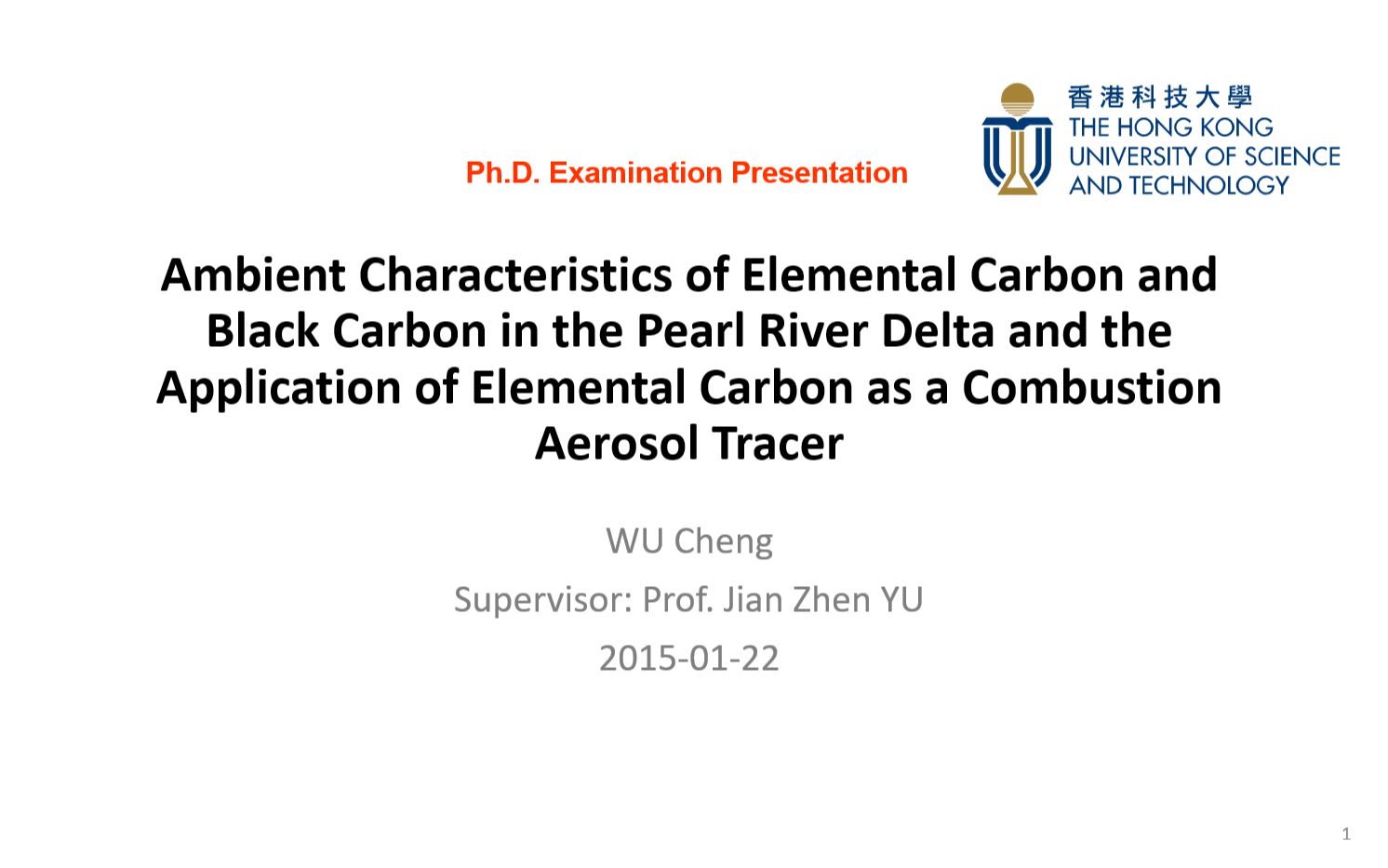 Ph.D. Examination Presentation Title :Ambient Characteristics of Elemental Carbon and Black Carbon in the Pearl River Delta and the Application of Elemental Carbon as a Combustion Aerosol Tracer by WU Cheng Supervisor: Prof. Jian Zhen YU 2015-01-22