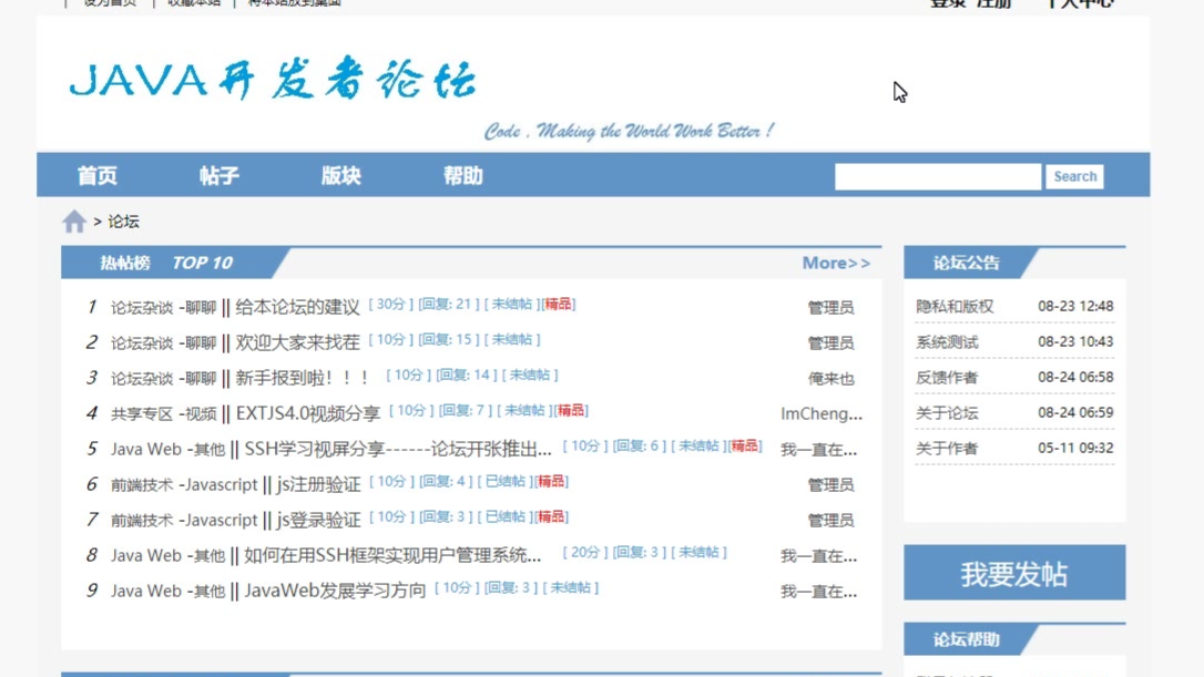 基于SSH的IT论坛系统-javaweb论坛系统MySQL数据源1.包含源程序,数据库脚本。代码和数据库脚本都有详细注释。2.课题设计仅供参考学习使用,可以在此基础上进行扩展完善开发环境:Eclipse ,MYSQL,JDK1.8,Tomcat 7涉及技术点:MVC模式、Struct、Hibernate、Spring、HTML、JavaScript、CSS、JQUERY、DWR、Ajax等系统采用Hibernate框架实现ORM对象关系映射,前台JSP实现,后台springMv