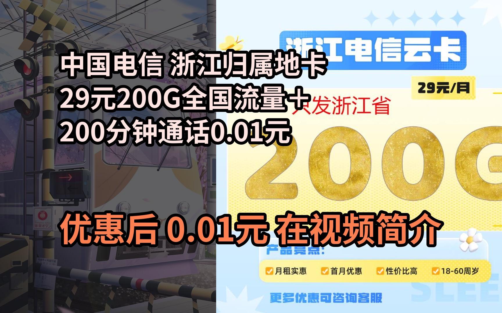 仅发浙江卡29元200G全国流量+200分钟通话