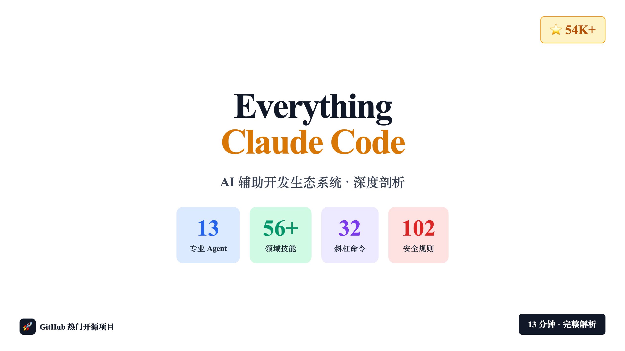 在 GitHub 上,everything-claude-code 项目获得了超过 54,000 个 star,它不是一个简单的配置文件,而是一个完整的 AI 辅助开发生态系统。本视频将深度剖析这个项目的架构设计,从底层规则系统到 13 个专业 Agent 的协作机制,从 56+ 个领域技能到持续学习系统,带你理解它如何让 Claude Code 变得更强大。 涵盖内容: 📋 双层规则体系:通用规则 + 语言特定规则 🛠️ 56+ 技能系统:结构化 Prompt 模板 + 工作流定义 🤖 13 个 Age