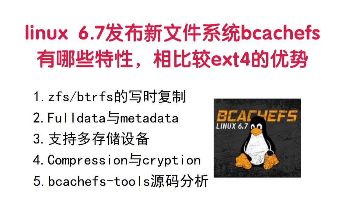 linux 6.7发布新文件系统bcachefs,有哪些特性,相比较ext4的优势 1. zfs / btrfs的写时复制 2. Fulldata与metadata 3. 支持多存储设备 4. Compression与cryption 5. bcachefs-tools源码分析