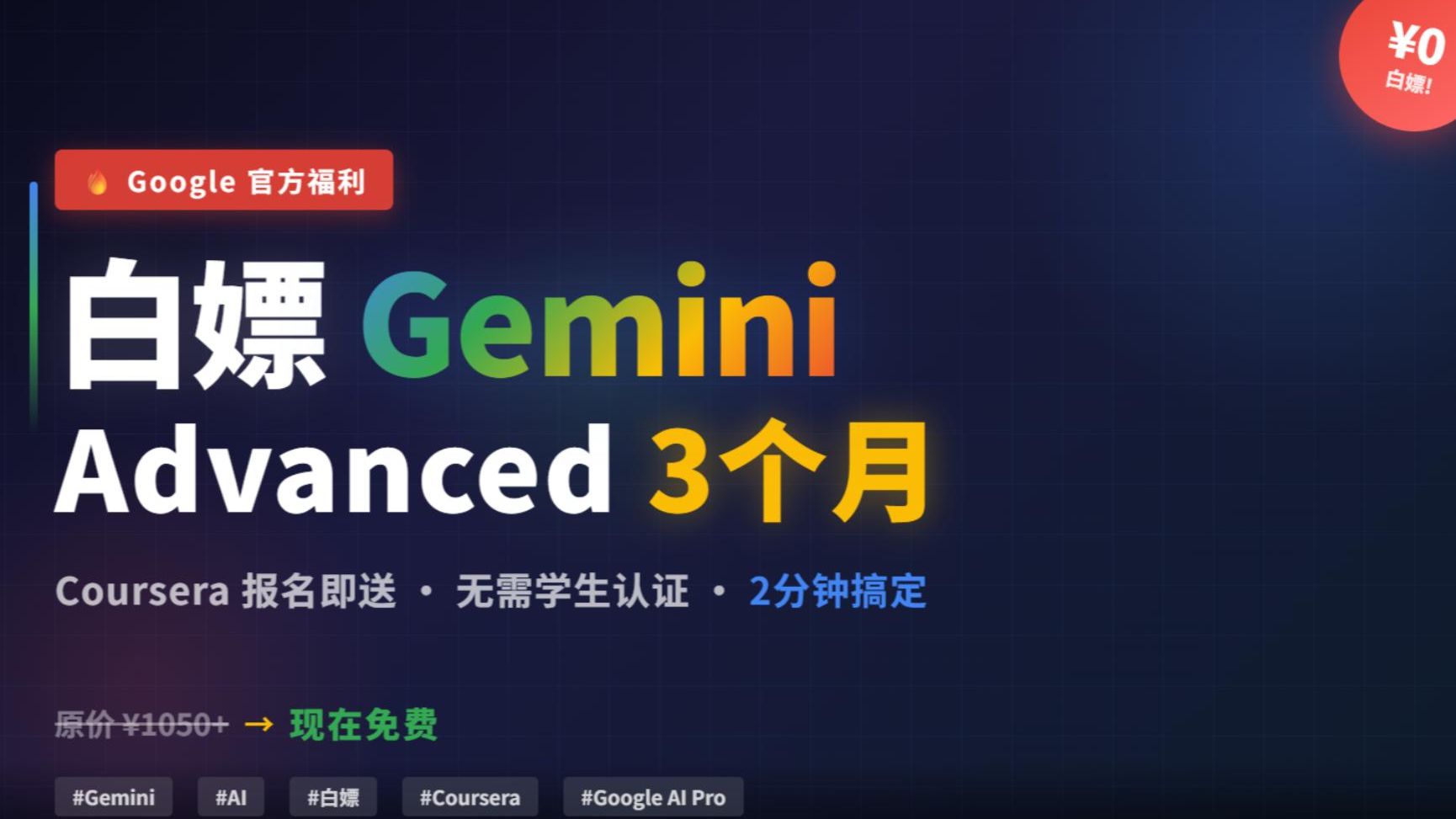 Google刚在Coursera上线了Google AI Professional Certificate课程,报名就送3个月Google AI Pro(Gemini Advanced),正常订阅要$49/月,现在免费拿。不需要学生认证,不需要edu邮箱,2分钟搞定。 🔗 课程链接:https://www.coursera.org/professional-certificates/google-ai ⚡ 操作步骤: 打开上面的链接 注册/登录Coursera(谷歌账号一键登录) 报名课程(选7天免费试用