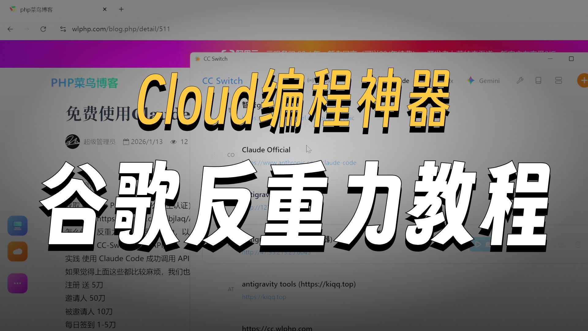 (自备魔法) 获取 Google Pro(不讲怎么学生认证)可某鱼购买 开源项目 https://github.com/lbjlaq/Antigravity-Manager 反重力工具 如何配置(不讲网络代理) 怎么使用 反重力工具 登录 反重力,以及 如何 开启 API反代 如何使用 CC-Switch 配置 API反代 实践 使用 Claude Code 成功调用 API 如果觉得上面这些都比较麻烦,我们也特地准备了自建中转站,方便大家使用 注册 送 5刀 邀请人 50刀 被邀请人 10刀 每日签到
