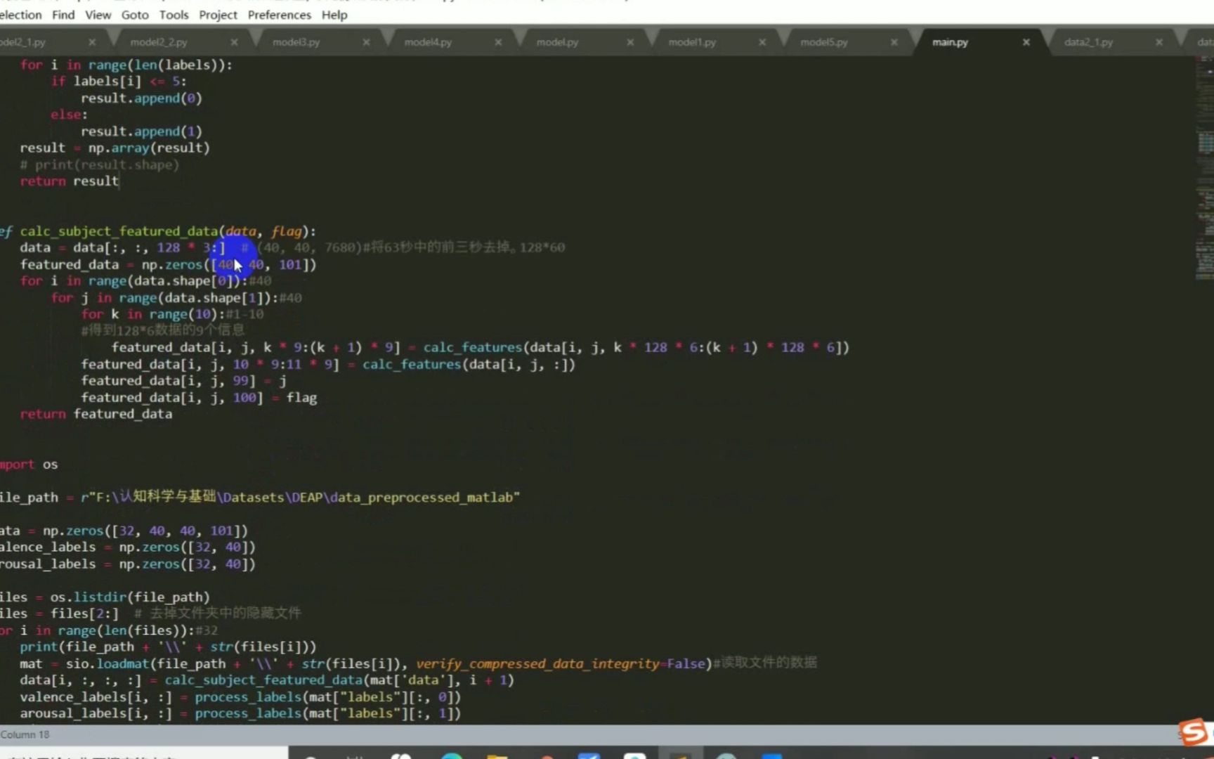 脑电情绪识别: 主要分为三步骤:数据预处理,特征提取,构建模型。 数据预处理部分建议自己处理。其中一定要做的就是去掉63s的前三秒的基线时间。 可以考虑的地方特别多,例如选取哪几个通道,并不是一定把32个脑电通道全部选择。选择哪几个频段分析或者选择单个维度还是多个维度融合。 特征提取部分: 首先必须清楚特征分为几类:频域、时域、时频域、空间域。 时域特征包含基本的事件相关电位、功率 、Hjorth 参数特征 、高阶过零分析等等 频域特征包含功率、功率谱密度、事件相关同步化、事件相关去同步化、高阶谱、微分 熵等特征 在刚开始做的时候,先做的时域特征的提取:最简单的就是直接将60s的脑电信号处理。或者提取其中一些比较有意义的相关特征。但是准确率并不高,只有60多。 之后参考了一些网上的思路,采用了频域上的特征提取。主要参考了github上的Preprocess_deap的处理。首先选择了1,2,3,4,6,11,13,17,19,20,21,25,29,31共14个通道,分别对应于 1 : AF3; 2: F3; 3: F7; 4: FC5; 7: T7; 11: P7; 13: O1 17: AF4; 19: F4; 20: F8; 21: FC6; 25: T8; 29: P8; 31: O2 构建模型部分: 构建了多个模型进行对比:包括DNN模型,LSTM模型,RNN模型以及卷积神经网络结合LSTM模型,最终准确率有了比较大的提高,达到95%左右。