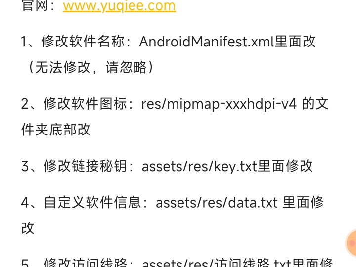 先下载好母体安装包(APK文件),然后下载MT文件管理器,对母体安装包修改! 1、修改软件名称:AndroidManifest.xml里面改(无法修改,请忽略) 2、修改软件图标:res/mipmap-xxxhdpi-v4 的文件夹底部改 3、修改链接秘钥:assets/res/key.txt里面修改 4、自定义软件信息:assets/res/data.txt 里面修改 5、修改访问线路:assets/res/访问线路.txt里面修改(非特定请勿修改) 官方:www.yuqiee.com