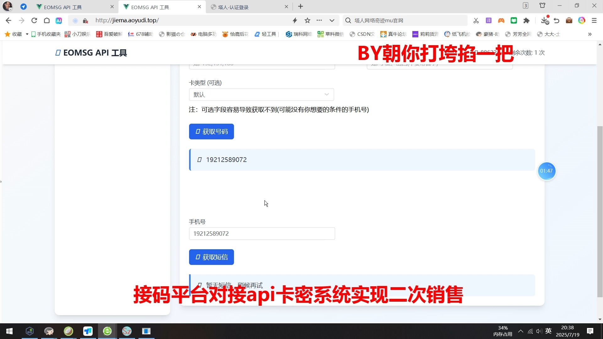 对接豪猪和椰子平台实现卡密接码 卡密接码系统 可对其他接码平台实现二次销售 先拿椰子做例子 拿一个举个例子 可以设置接码次数 和项目名称 指定项目接 次数自由更改 实现二次销售 用 的是你所对接的平台余额 你自己充值 然后给客户开账号设置项目和接码次数 按照你指定的项目 就只能获取你指定的项目来接码 这样就好了 刷新看下次数 0次就不能接了 需要几次 可以设置接几次 这样大批量客户可以让他自己操作接码 不会影响到自己 出此系统,接对接各类