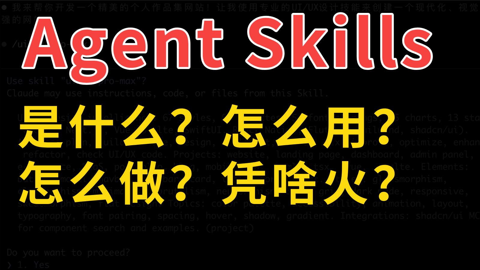 1个视频带你玩转 Agent Skills,小白也能学会的 Claude Skills 保姆级教程!看完你就知道怎么让 Claude/Cursor 等 AI编程工具瞬间变专业了。 编程学习教程+实战项目+简历模板:codefather.cn 鱼皮的免费 AI 编程教程:ai.codefather.cn 详细讲解目前最火的AI技术 Agent Skills 是什么、怎么安装使用、揭秘内部原理、如何开发自己的SKills技能包。从Claude Code官方技能市场到社区热门的UI UX Pro MAX前端工具