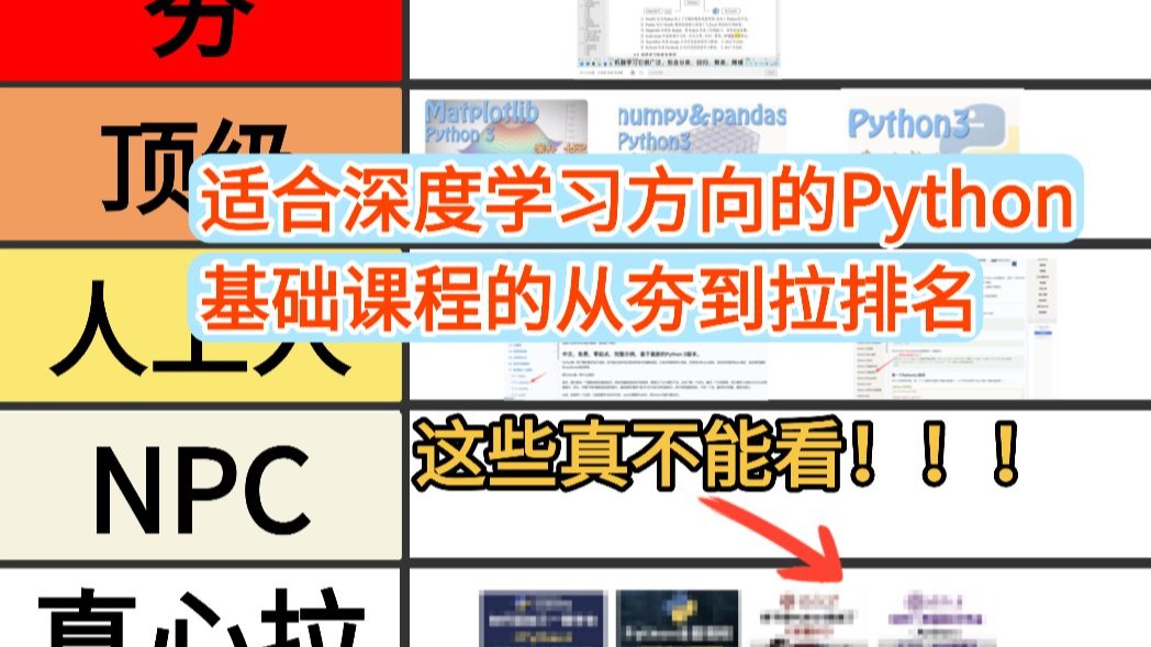 今天以我个人主观角度来锐评一下适合深度学习方向的python基础课程的从夯到拉排名,future也是老B站up主了,比较清楚哪些课程是比较好的,首先一定要注意的是,搞深度学习不用系统学python,只需要掌握这些基础知识就够了,别浪费时间。