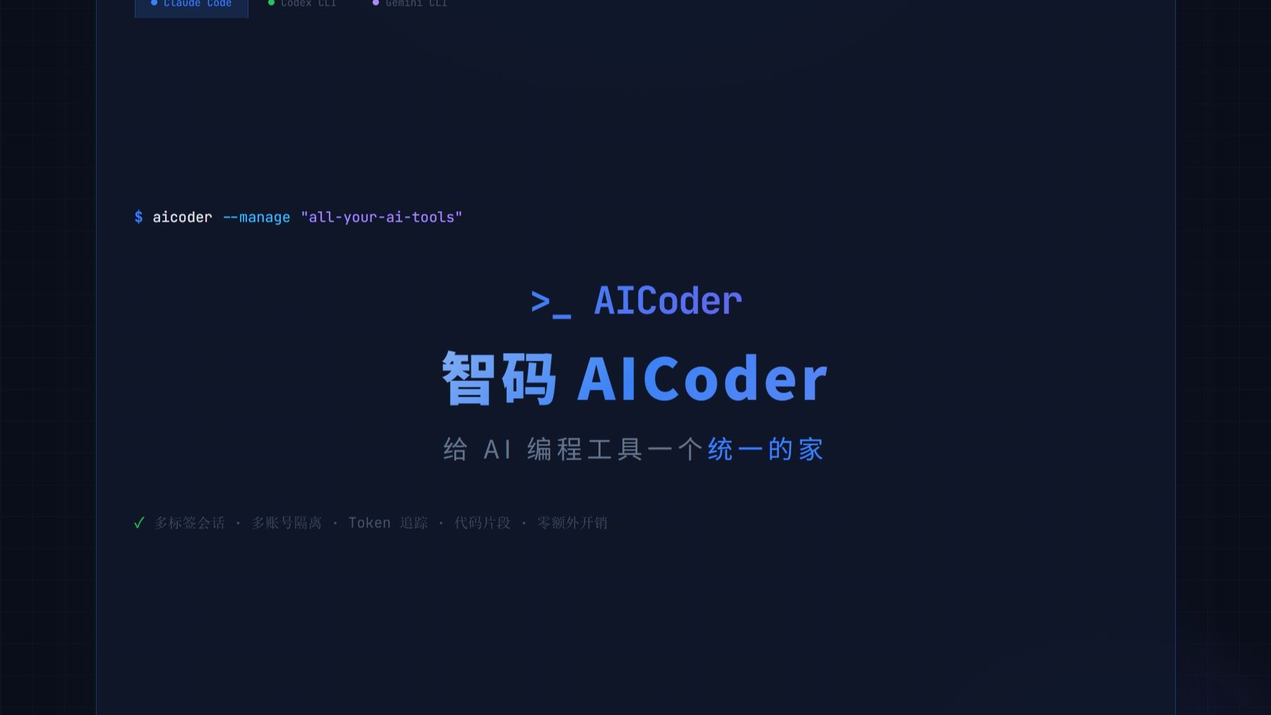 用 AI 写代码很爽,管理它们很痛苦——所以我做了智码 AICoder Claude Code、Codex、Gemini CLI 越用越多,终端窗口越开越乱。智码 AICoder 给你的 AI 编程工具一个统一的家。 一、为什么要做这个工具? 如果你也在用 Claude Code、Codex CLI 或 Gemini CLI 写代码,一定遇到过这些糟心事: 找不到历史对话。 CLI 的会话文件藏在 ~/.claude/projects/ 的层层目录里,想找上周那个重构方案,翻半天翻不到。 多账号切不动
