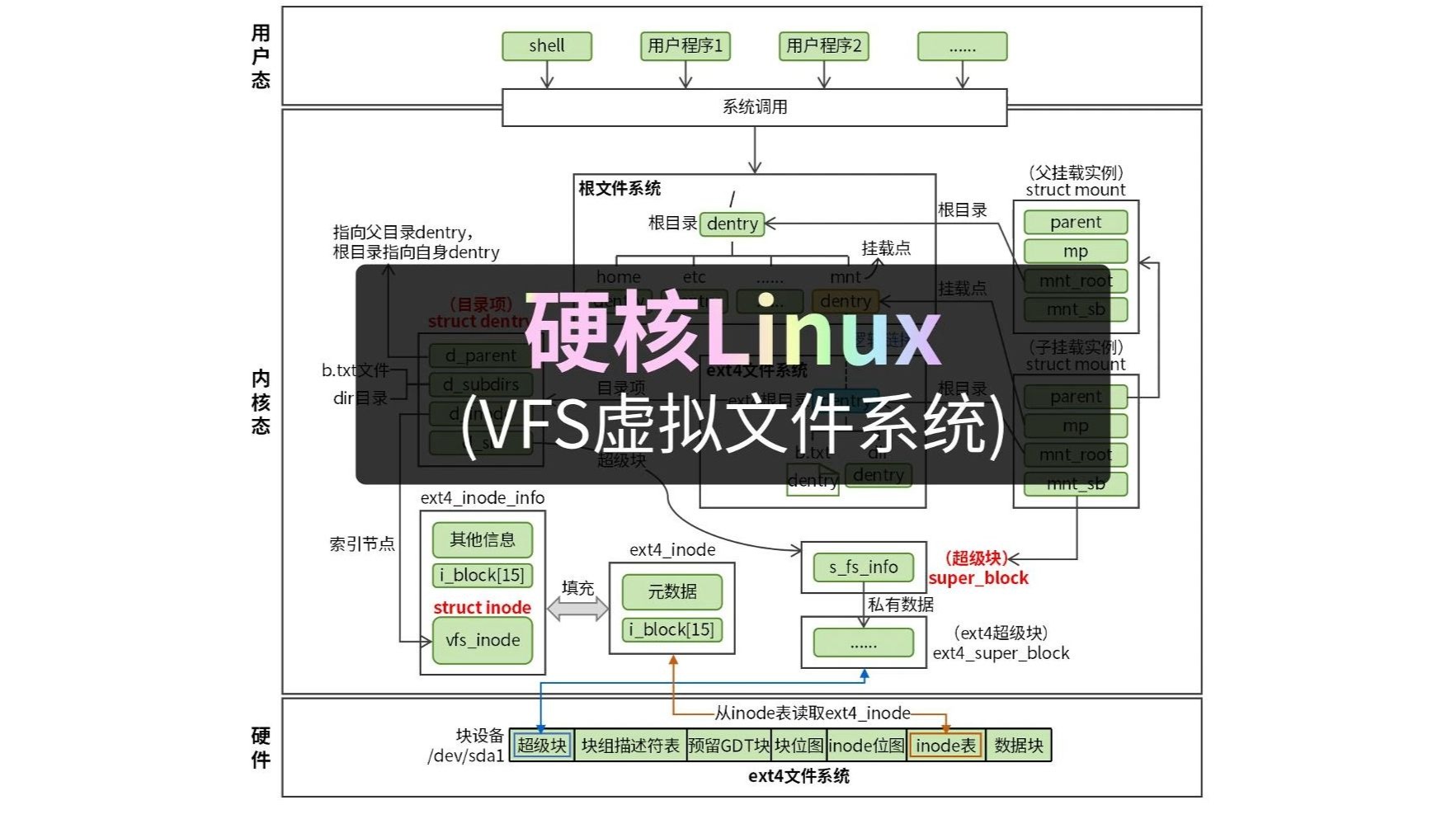 揭秘Linux一切皆文件。 深度探索Linux VFS虚拟文件系统,VFS四大核心对象:dentry(目录项)、inode(索引节点)、super_block(超级块)、file(文件对象)详细介绍。 ext4文件系统、Linux挂载简介。