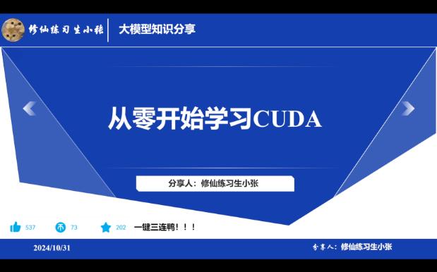 这是一个从零学习cuda编程的日记 https://github.com/zhangtianhong-1998/Cuda_learn 后续开发的大模型推理框架将基于这套前序课程进行扩展,逐步开始开发 推理框架代码将随开发实时开源更新,开源地址将会在此更新 https://github.com/zhangtianhong-1998/LLM_infra_from_scratch.git 录制视频将会通过充电或者课堂形式进行开放