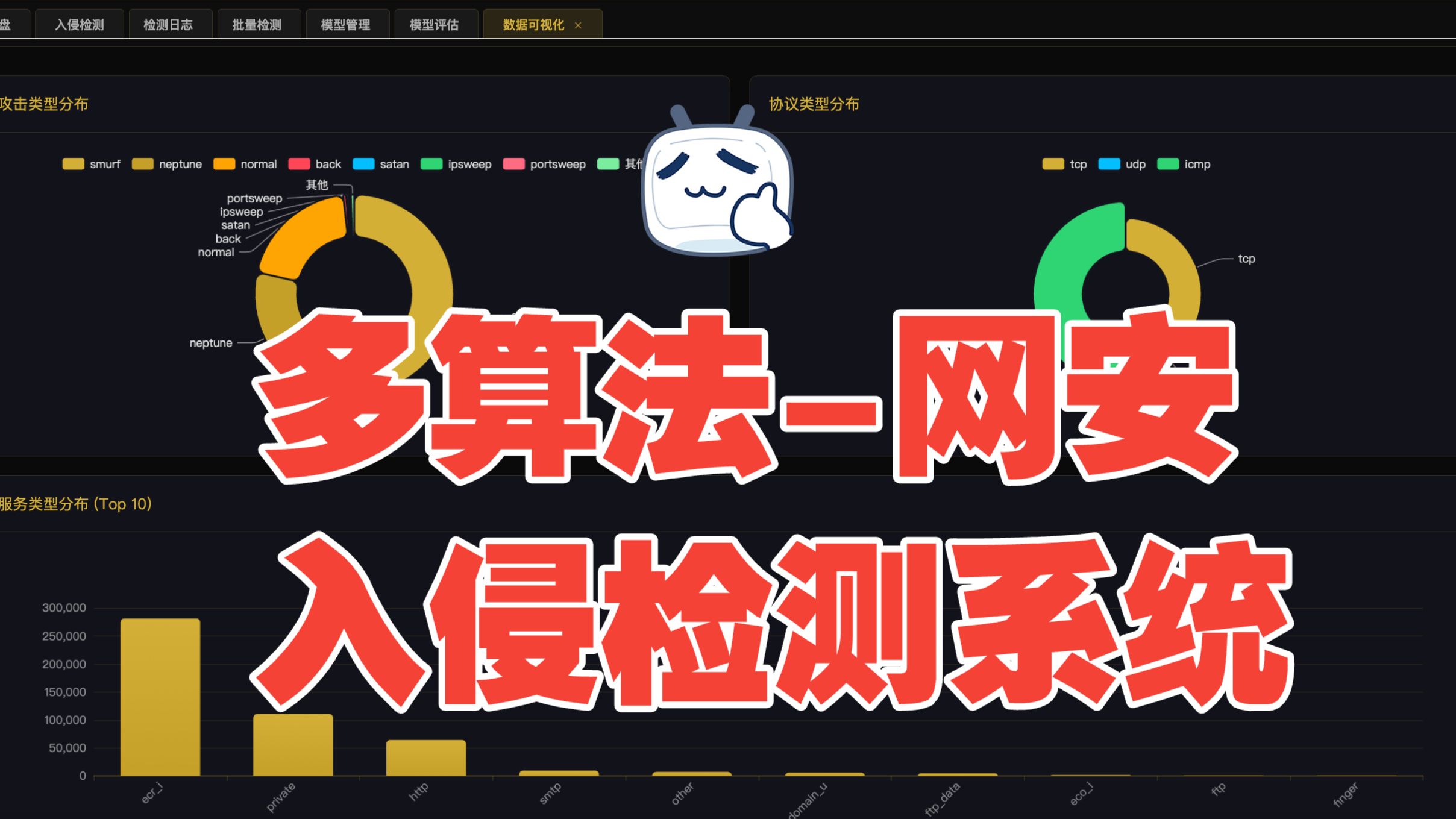 编号F065: 基于机器学习的KDD CUP99网络入侵检测系统 本项目是一套完整的网络入侵检测系统,基于KDD CUP 99数据集训练多种机器学习模型,实现网络流量分类检测。 技术架构: 系统采用前后端分离架构。前端使用Vue2配合ElementUI构建用户界面,通过ECharts实现数据可视化;后端基于Flask框架开发,提供RESTful API接口。数据库采用MySQL存储用户信息和检测日志,机器学习模型使用Scikit-learn和PyTorch训练完成。 核心功能: 系统集成了决策树、K近邻、