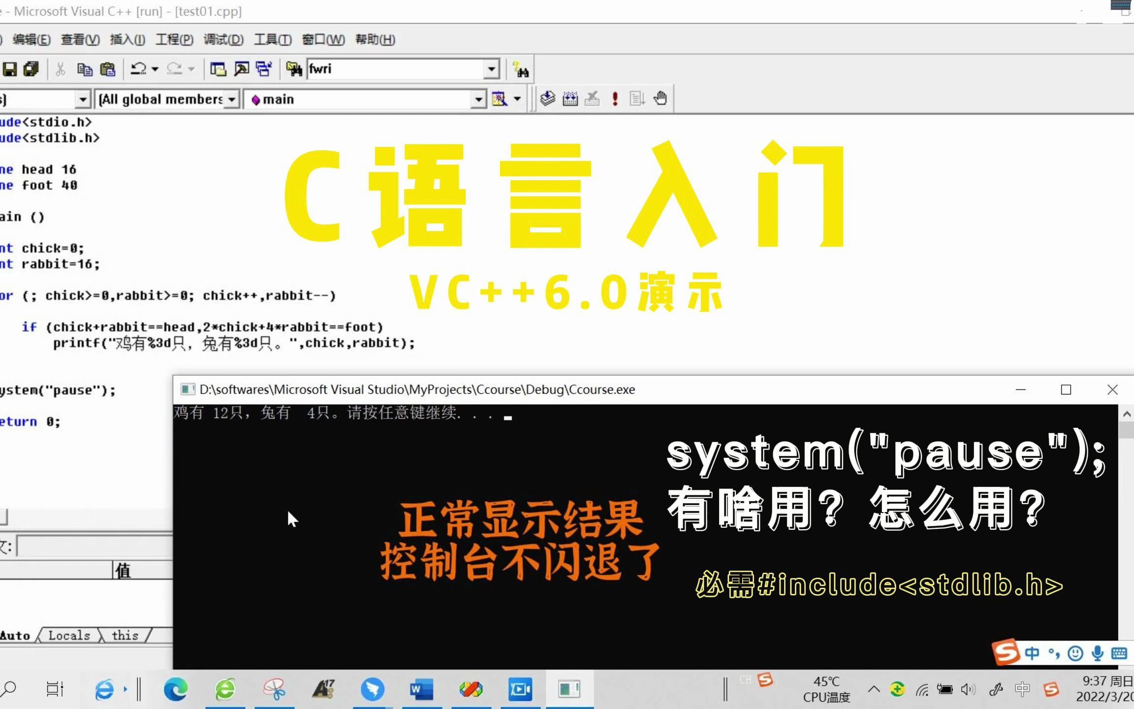 VC6软件演示C语言程序的编译、组建、运行: 调用system("pause");时,必须包含这个头文件#include 。 就像调用printf("...");时,必须包含这个头文件#include 一样