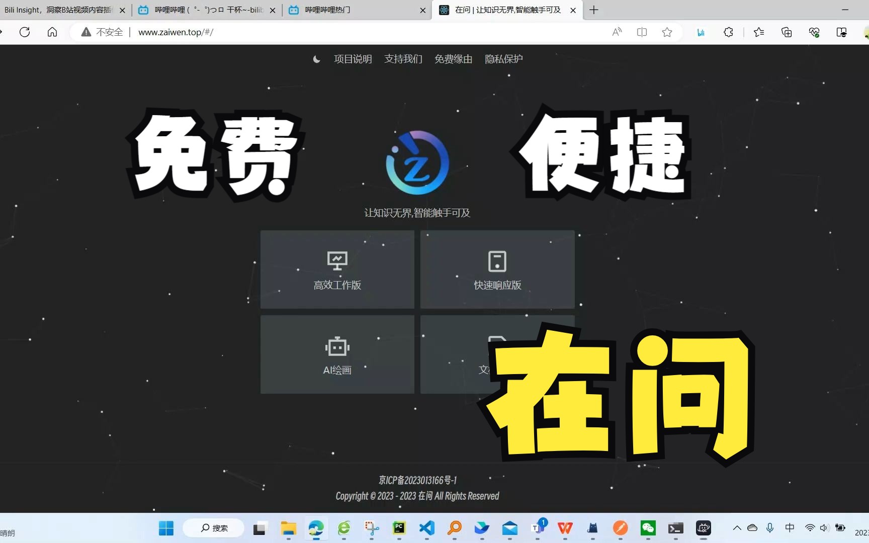 在问 免费,便捷的ChatGPT [本项目永不收费、永不接受广告与推广] 让知识无界,智能触手可及 在问 | 让知识无界,智能触手可及 (zaiwen.top) 勿以恶小而为之,勿以善小而不为。 人人皆为萤火,则人人皆可被照亮。 如果不能享受技术进步的便利,又怎么会有创造技术进步的动力。 您可以对技术感兴趣,但请不要对我这个人感兴趣,如果您使用体验不错的话,说明算法和模型厉害,与本人无关。如一位名人说过:如果你吃到一个鸡蛋,觉得好吃,你又何必去认识下蛋的母鸡呢?