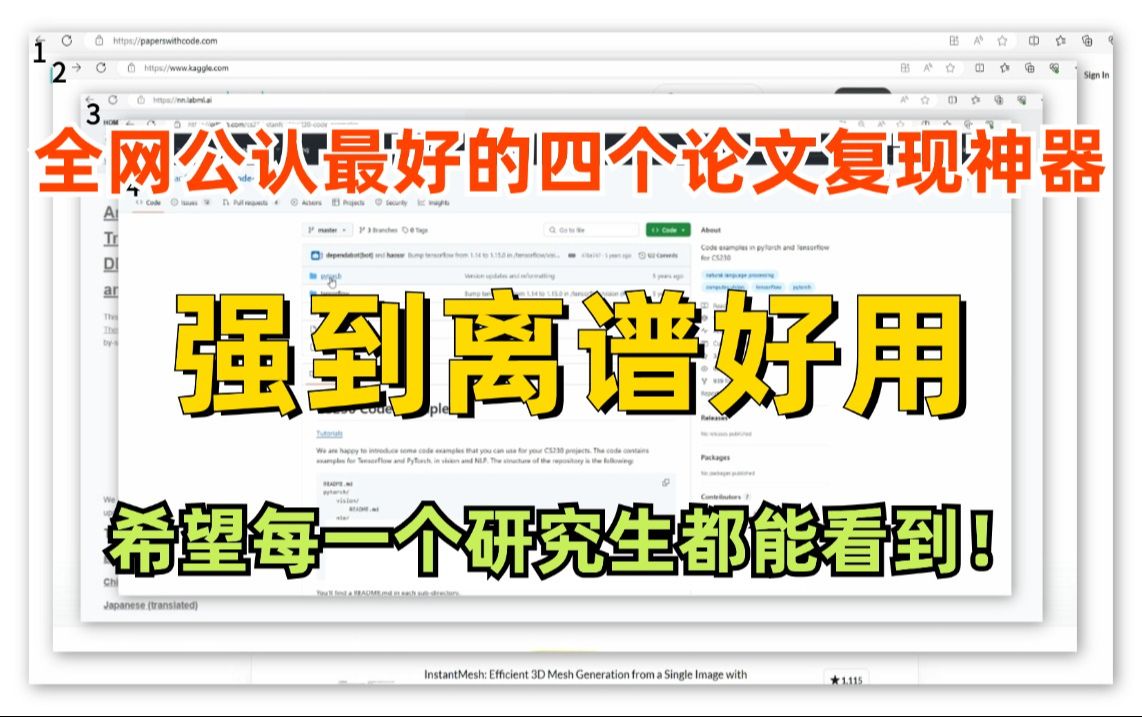 这4个论文复现神器简直太好用了! 1.papers with code:https://paperswithcode.com/ 2.kaggle:https://www.kaggle.com/ 3.代码逐行解读网站:https://nn.labml.ai/ 4.CS230代码模版:https://