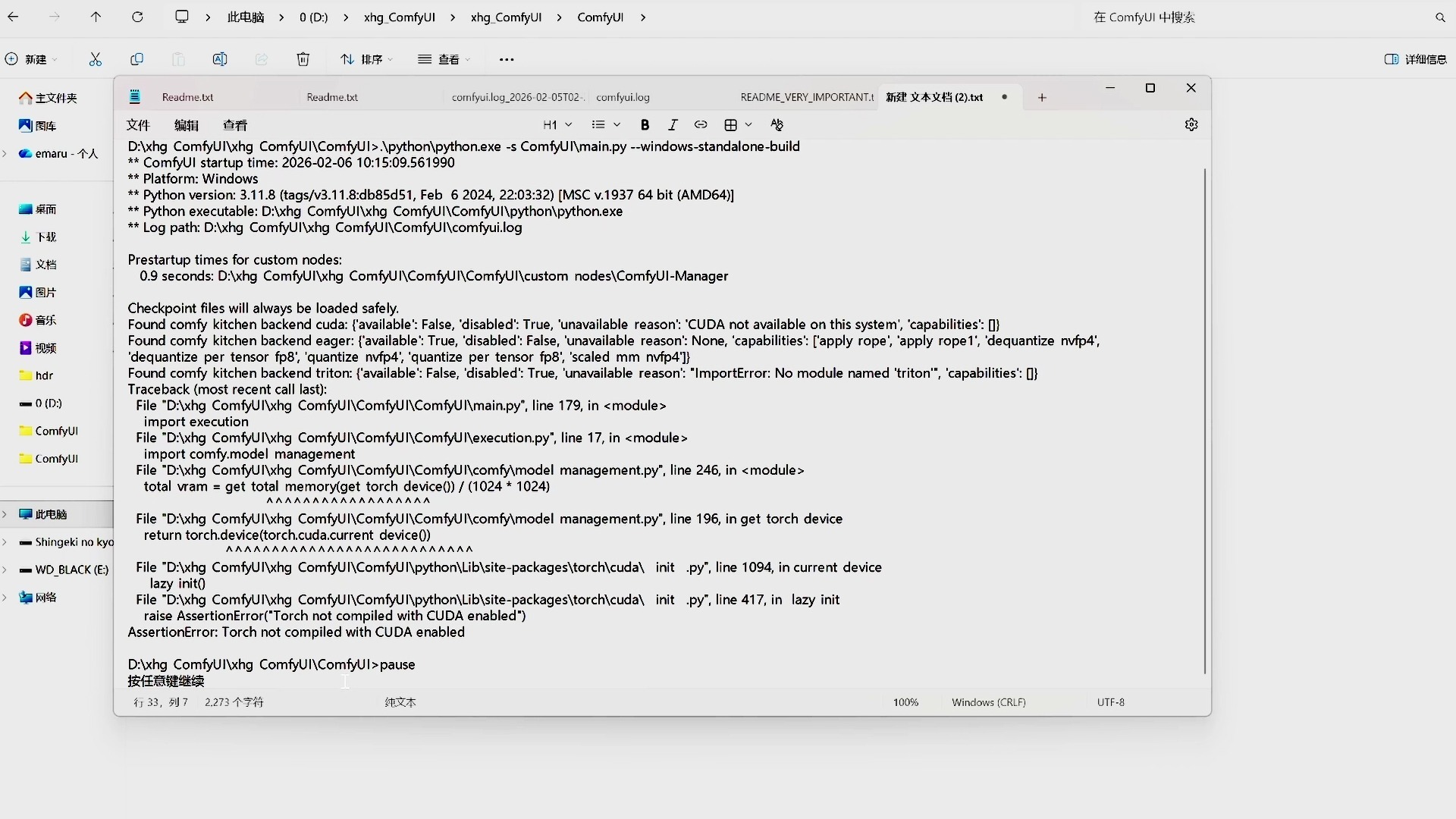 这是第一条代码:.\python\python.exe -m pip uninstall torch torchvision torchaudio -y 这是第二条代码:.\python\python.exe -m pip install torchtorchvision torchaudio --index-url https://download.pytorch.org/whl/cu128 还是要根据自己的显卡进行选择版本,不然依旧启动不了,不懂版本选择的可以百度一下,然后50系的要更新一下驱动
