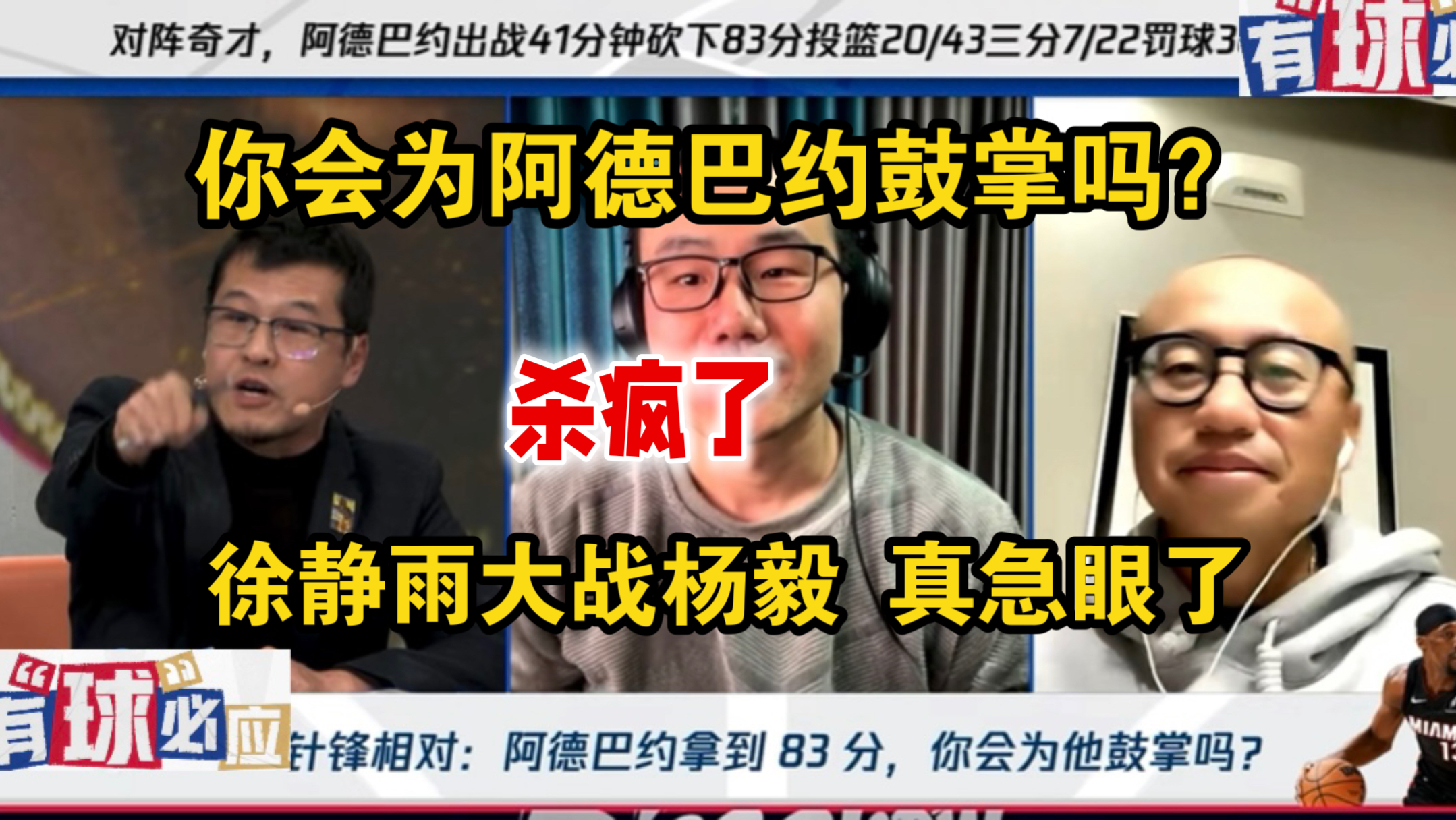 杀疯了!会为阿德巴约83分鼓掌吗?徐静雨大战杨毅 真急眼了!