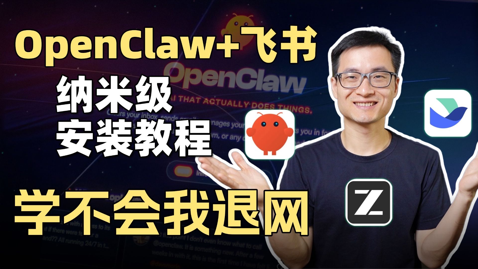 前几天发了一个视频讲解OpenClaw(原Clawdbot)安装+飞书对接,大家说配置过时了,另外有很多问题没有提到,OK,那今天我们再来一期最新的! 这个视频手把手带你从零开始: 1️⃣ 安装OpenClaw(一行命令搞定) 2️⃣ 配置智谱最新的GLM5模型(Kimi、MiniMax、智谱、千问都支持) 3️⃣ 对接飞书,直接在飞书上跟AI机器人聊天 4️⃣ 提效实战演示(飞书文档管理、github管理、控制电脑写代码等等) 飞书对接部分需要: - 安装飞书插件 - 在飞书开放平台创建企业自建