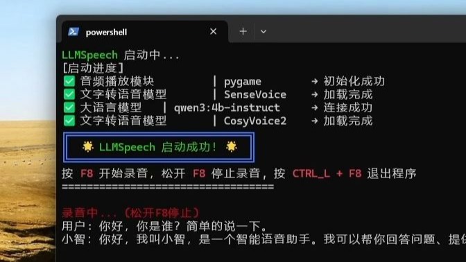 https://gitee.com/sciencewys/LLMSpeech 跟着README文件一步步做就能部署在自己的电脑了~ 项目名称 LLMSpeech。通过开源项目:语音转文字模型 SenseVoice,文字转语音模型 CosyVoice2,大语言模型服务 Ollama,键盘鼠标宏 KeymouseGo。LLMSPeech 可实现地语音聊天、控制电脑做出简单操作的功能。