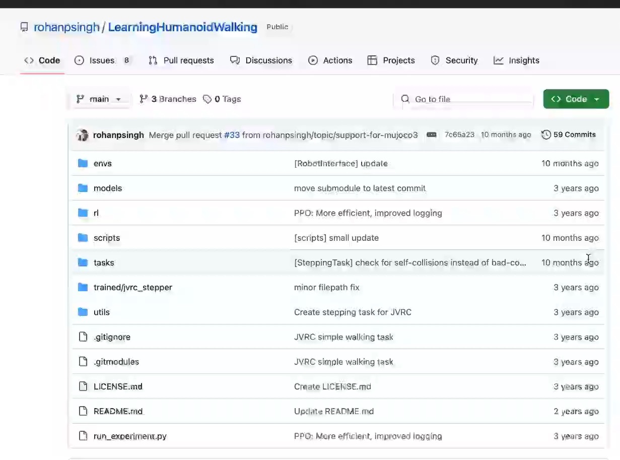这是我学习强化学习的项目,后来训练模型部署至舵机机器人的代码也是基于此项目修改的。此项目比较简单,适合有计算机、深度学习基础的人入门强化学习。 项目地址 https://github.com/rohanpsingh/LearningHumanoidWalking